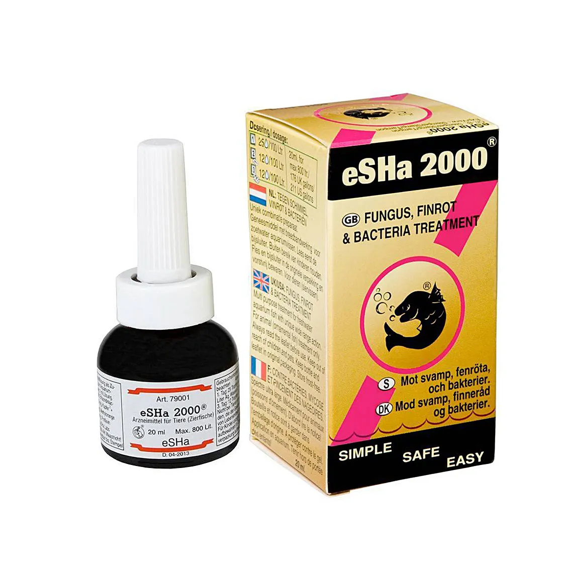 eSHa 2000 je univerzalni preparat za lečenje i prevenciju bolesti kod akvarijumskih riba. Namenjen je suzbijanju bakterijskih i gljivičnih infekcija, kao što su truljenje peraja, oštećenja kože, rane, čirevi, gljivice i problemi sa škrgama.